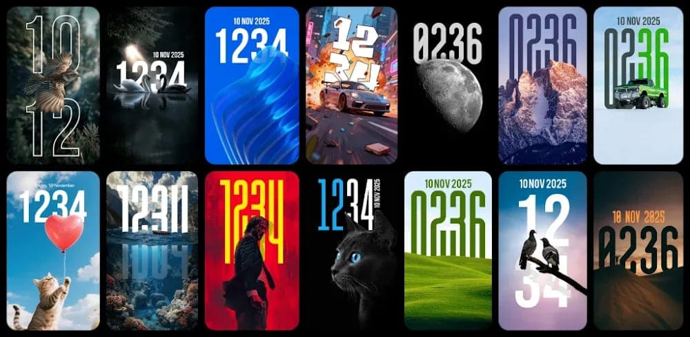 Each wallpaper includes a seamlessly integrated live clock and date that’s designed as part of the artwork—not just an overlay—creating a unique and polished look.